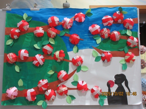 9月の壁画はリンゴを折り紙で作りました。立体的で見ごたえあり‼