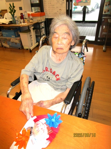 笑顔の写真付き扇を持って、歌を歌いました!